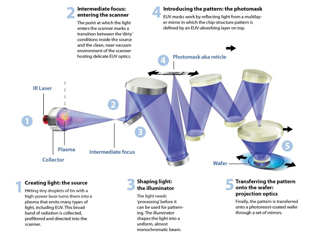 Khác với quang khắc truyền thống (đời chip 10nm, 14nm hoặc cũ hơn), vốn dùng thấu kính và mask trong suốt, thì quang khắc EUV sử dụng gương phản xạ và mask phản xạ. Nguyên nhân chính là với bước sóng quá nhỏ (13.5nm) EUV bị giảm năng lượng quá nhiều khi khúc xạ qua hệ thống thấu kính. Nếu